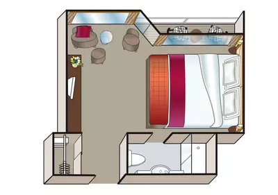 Each cabin features a spacious bathroom with a walk-in shower, luxurious Rituals bath products, and a hair dryer, along with a fixed panoramic window that fills the space with natural light. Thoughtful touches like a comfortable double or twin bed, generously-sized wardrobe, secure in-room safe, flat-screen TV, individual climate control, and direct dial telephone ensure a restful and well-equipped stay.