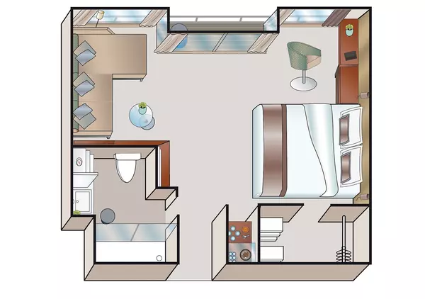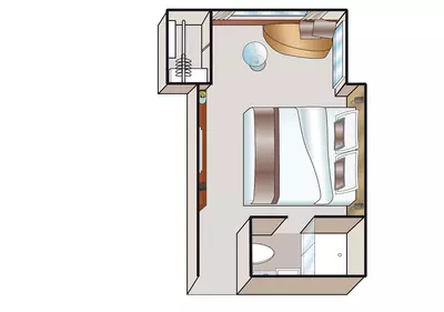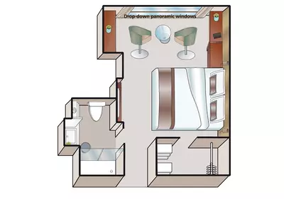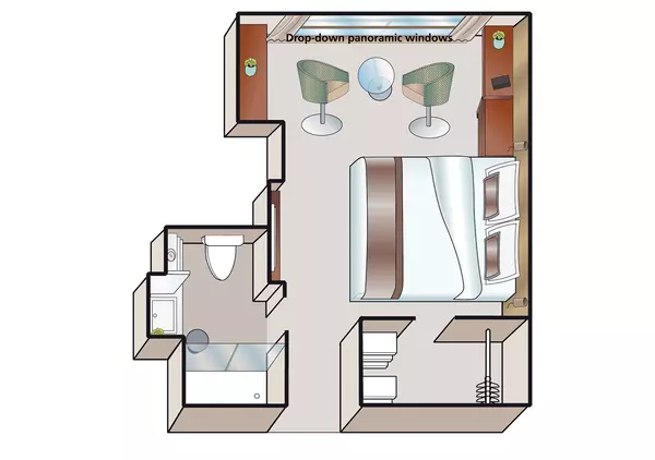 Each cabin features a spacious bathroom with a walk-in shower, luxurious Rituals bath products, and a hair dryer, along with a fixed panoramic window that fills the space with natural light. Thoughtful touches like a comfortable double or twin bed, generously-sized wardrobe, secure in-room safe, flat-screen TV, individual climate control, and direct dial telephone ensure a restful and well-equipped stay.