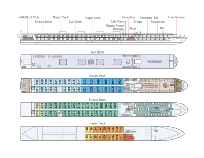 Step aboard into a newly-designed atrium where natural light abounds, highlighting an impressive staircase of glass and marble that invites you to explore. With 72 deluxe cabins and 12 AMADEUS suites, there is room to tailor your accommodations, whether you prefer double or twin bed, panoramic windows or a walk-out balcony. Experience the state-of-the-art fitness center or ascend to the expansive sun decks to study the passing landscapes along the Danube or the Rhine. Snuggle up in the Cafe Vienna for a quiet afternoon coffee. The AMADEUS Imperial moves through all the seasons, leaving you dreaming of your next river adventure.