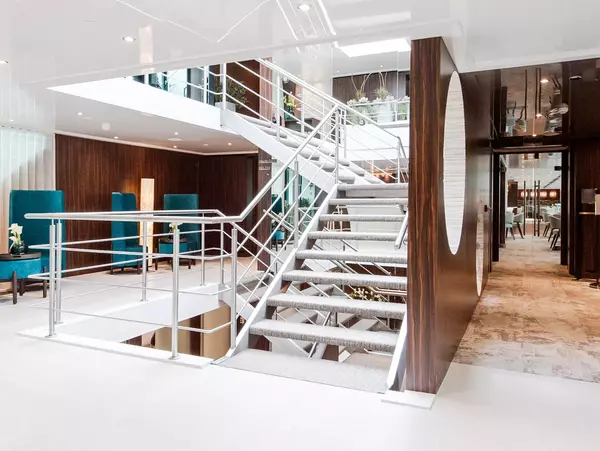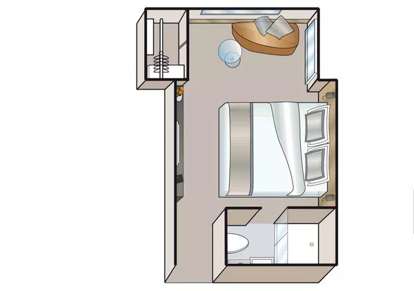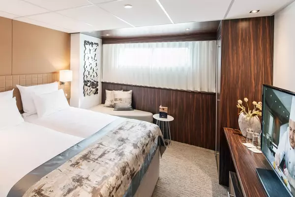 Each cabin features a spacious bathroom with a walk-in shower, luxurious Rituals bath products, and a hair dryer, along with a fixed panoramic window that fills the space with natural light. Thoughtful touches like a comfortable double or twin bed, generously-sized wardrobe, secure in-room safe, flat-screen TV, individual climate control, and direct dial telephone ensure a restful and well-equipped stay.