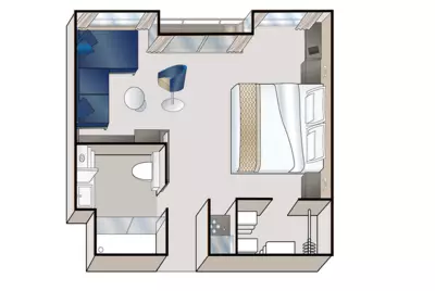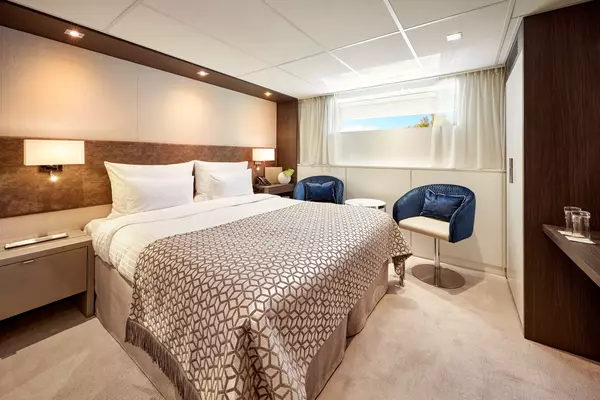 Each cabin features a spacious bathroom with a walk-in shower, luxurious Rituals bath products, and a hair dryer, along with a fixed panoramic window that fills the space with natural light. Thoughtful touches like a comfortable double or twin bed, generously-sized wardrobe, secure in-room safe, flat-screen TV, individual climate control, well-stocked minibar and direct dial telephone ensure a restful and well-equipped stay.