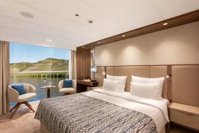 These staterooms feature the AMADEUS Signature Bed (available as a double or twin), a drop-down panoramic window for uninterrupted river views, a spacious bathroom with a walk-in shower and premium Rituals® bathing products, walk-in wardrobe, flat-screen TV, individual climate control, well-stocked minibar, in-room safe, bathrobe and slippers, hair dryer, and direct dial telephone — ensuring a comfortable and refined travel experience.