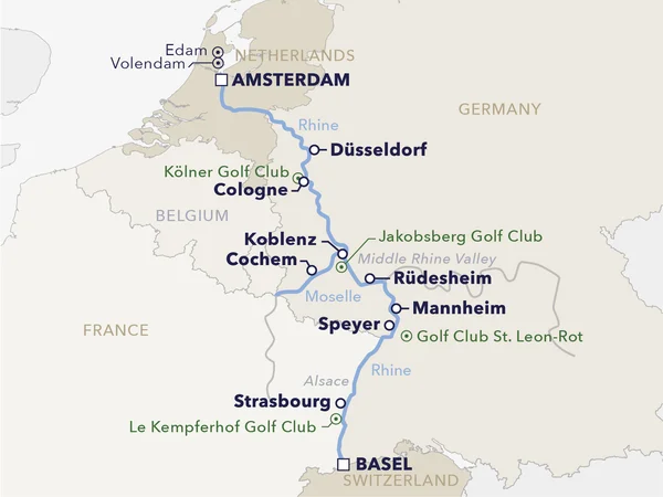 Enjoy the ultimate golf escape on our luxurious cruises, designed both for the hardcore golf enthusiast as well as holidaymakers for whom it is a secondary interest. Travel on the romantic Rhine from Basel to Amsterdam, enjoying a stress-free golf vacation with exceptional service and great golf at some of Europe’s most spectacular venues. Throughout the cruise, enjoy the services and in-depth knowledge of our golf expert. With exciting golfing opportunities, breathtaking scenery and true Austrian hospitality, this cruise is sure to be unforgettable!