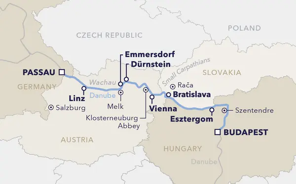 This classic cruise brings together glorious cities along one of the world‘s most beautiful stretches of rivers on a trip through the heart of Old World Europe. This quintessential cruise along the beautiful Danube begins in the “Three Rivers City“ of Passau at the confluence of the Inn, Ilz and Danube rivers and takes you all the way to the “Queen of the Danube“ — the capital city of Budapest, which straddles the river with its hilly ‘Buda‘ featuring Fisherman‘s Bastion & castle district over to the flat ‘Pest‘ side with its iconic Parliament building.