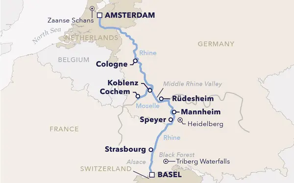 Along the way you will pass the beautiful city of Strasbourg and take a detour along the winding Moselle river. Delight in the panorama of the myth enshrouded Middle Rhine Valley with its winelands, the prominent Lorelei rock, and the highest density of castles in the world. Further highlights of this trip include visits to the very historic river cities of Speyer, Koblenz, Cologne and Amsterdam.