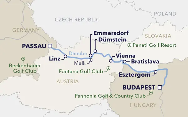 Enjoy the ultimate golf escape aboard our luxurious cruises—perfectly designed for passionate golfers and leisure travellers alike. Journey along the elegant Danube from Budapest to Passau and experience a seamless, stress-free golf holiday with exceptional service and outstanding play at some of Europe’s most spectacular courses. This carefully curated itinerary features golf at four outstanding venues, each set amid breathtaking scenery. Guaranteed tee times, transfers, green fees, shared golf carts, as well as cultural highlights, sightseeing and fine dining are all included—allowing you to focus entirely on your game and enjoyment. Throughout the cruise, benefit from the expertise and personal support of our experienced golf professional. Combined with inspiring landscapes, first-class golfing opportunities and warm Austrian hospitality, this journey promises an unforgettable experience on and off the fairway.