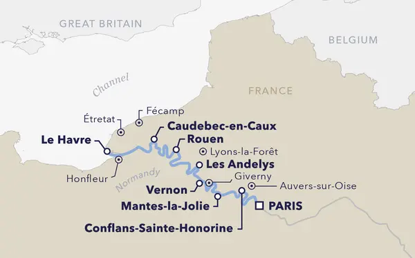 Follow the footsteps of Van Gogh, Cezanne and Gauguin while winding along the Seine River into the beautiful Normandy region to Le Havre on the rugged Atlantic Coast. Normandy was the stage of one of the most pivotal military operations in history: D-Day during World War II.